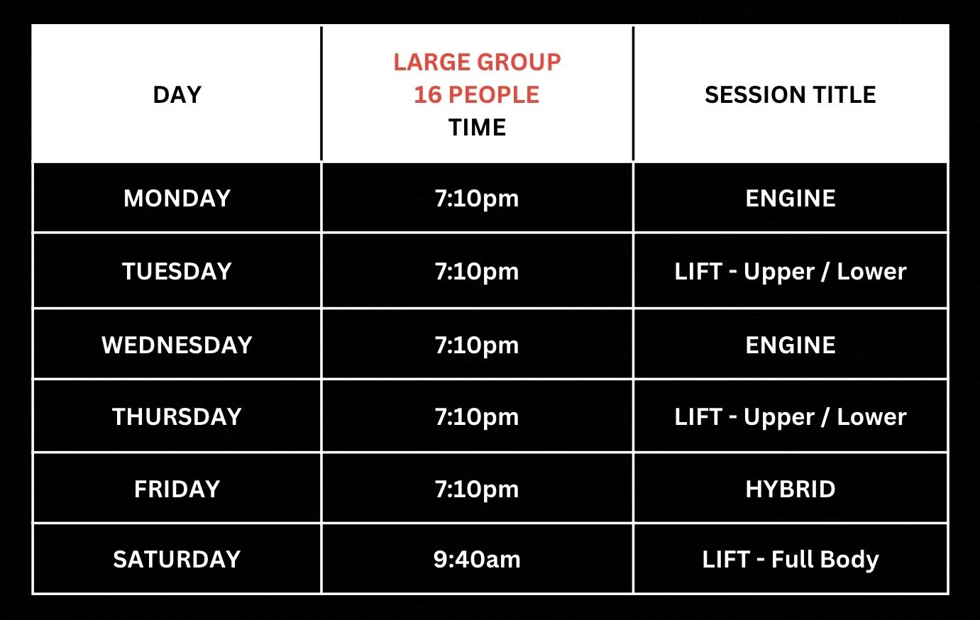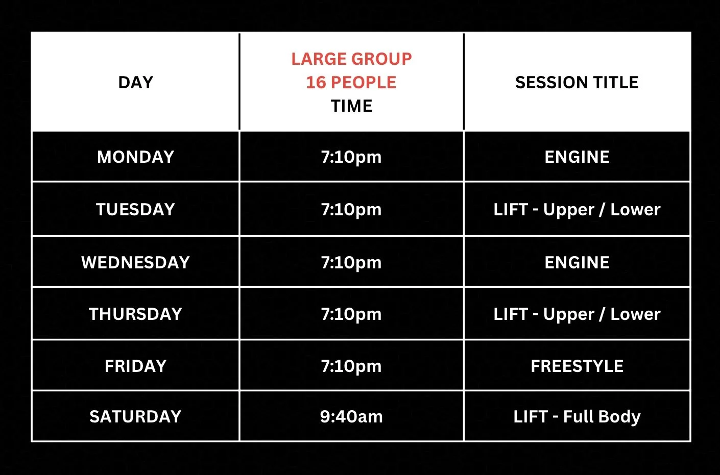 Our Large Group Training provides members with the most affordable way to train, whilst still maximising enjoyment and results. These sessions are capped at 16 members, and you will get to become a part of our awesome and friendly community. The programming is designed to cater for all ages, abilities and experience levels whilst maintaining a high level of personal coaching in a high energy environment.
